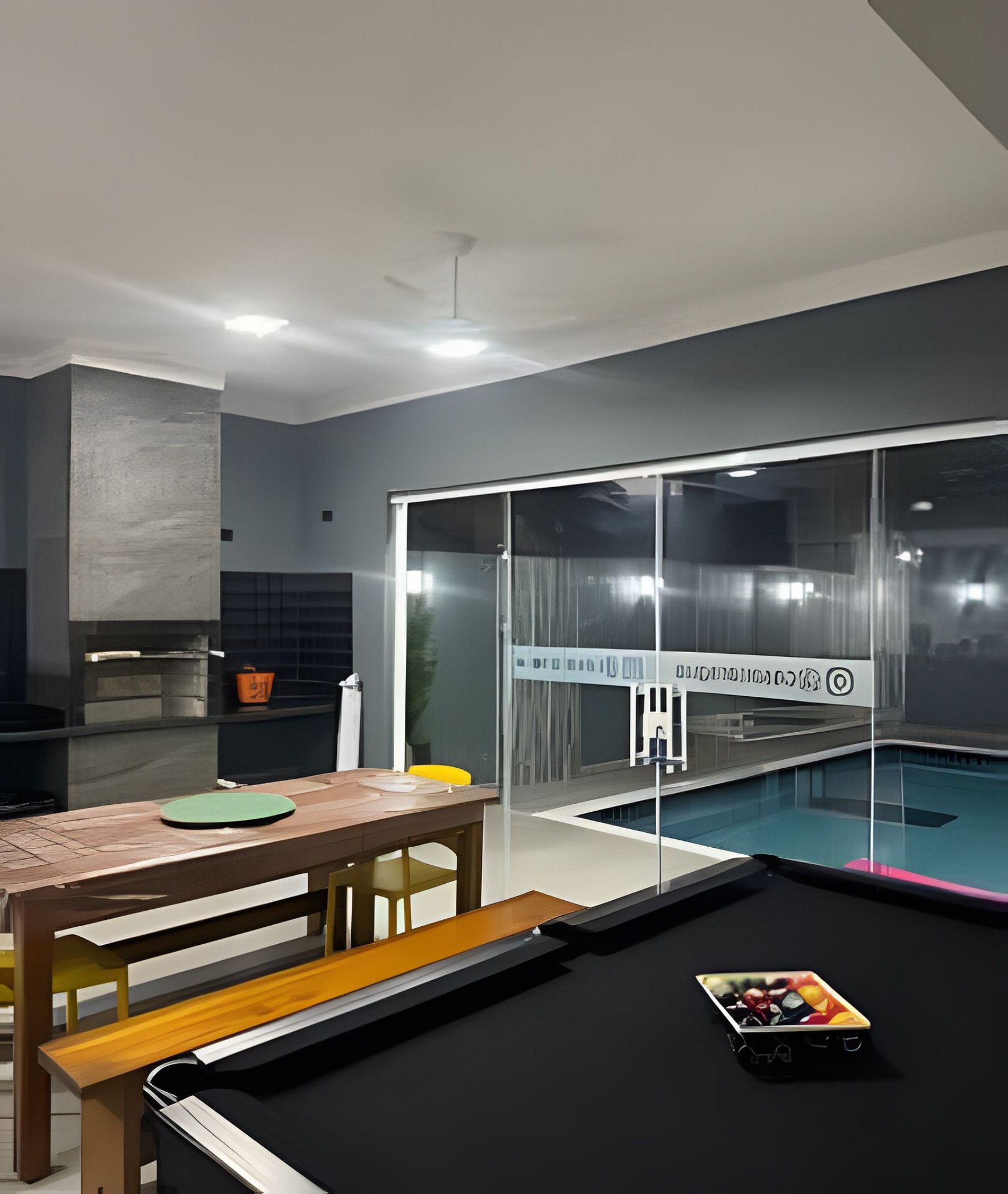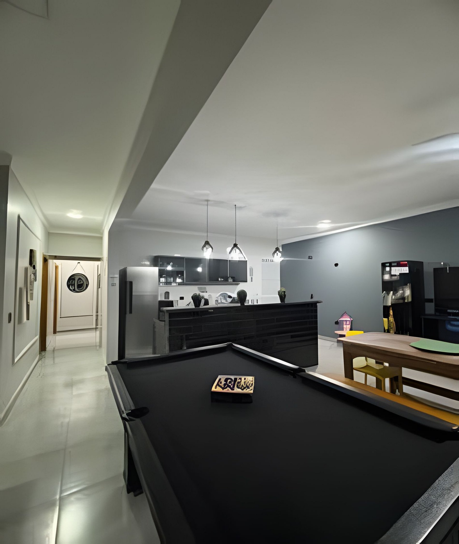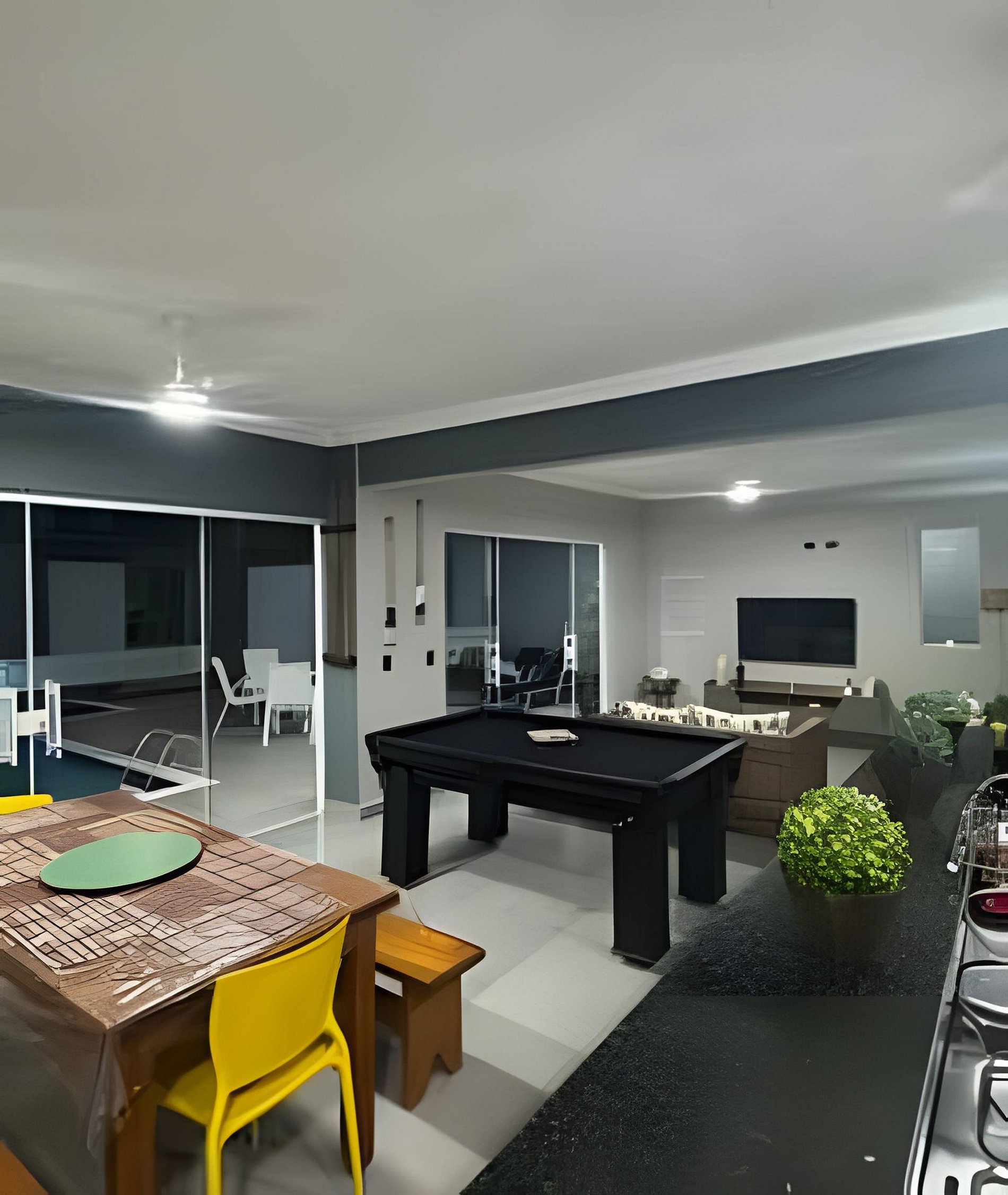 E a área gourmet integrada com a churrasqueira e mesa de sinuca faz os momentos ficarem mais especiais.